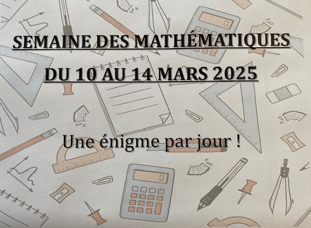 "Dans le cadre de la semaine des Mathématiques organisée au collège du 10 au 14 mars 2025, l’équipe de Mathématiques vous propose une énigme chaque jour !